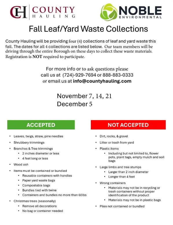 County Hauling will take leaves during regular collection days but those bags will count towards the weekly bag count (15 bags max). However, household waste will be prioritized over leaf collection.