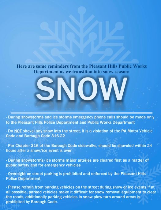Just a reminder that residents are responsible for maintaining the sidewalks in front of their homes and they must have them cleared of ice and snow within 24 hours of a snow event per Pleasant Hills Borough Code.